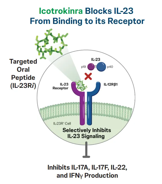 🎯 Путь IL-23/Th17 является центральным фактором развития аутоиммунных заболеваний, таких как псориаз. Как пептид, принимаемый перорально, икотрокинра точно блокирует рецептор IL-23, тем самым ингибируя последующие воспалительные каскады.
