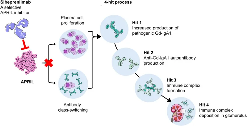 APRIL служит ключевым регулятором выживания В-клеток и переключения классов антител, играя центральную роль в патогенезе IgA-нефропатии: он способствует выработке антител IgA1 с дефицитом галактозы, которые составляют основу нефротоксических иммунных комплексов.